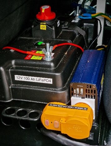 - LiFePO4 - 100 Ah - 12V (Versorgungsbatterie, hinter Fahrersitz, in Batteriekasten)
